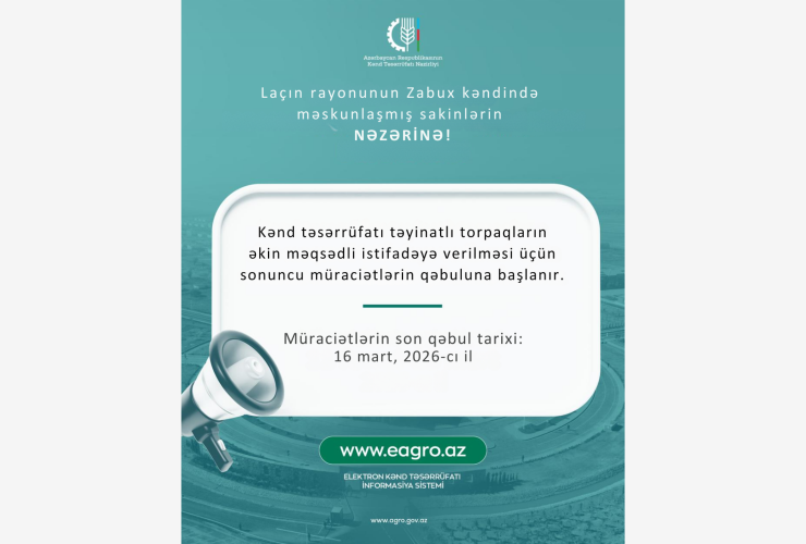 Müraciətlərin qəbulu Elektron Kənd Təsərrüfatı İnformasiya Sistemi (EKTİS) - eagro.az saytı vasitəsi ilə həyata keçirilir. Zabux kəndində məskunlaşan və yaşayan sakinlərdən sonuncu müraciətlərin qəbulu prosesi 16 mart, 2026-cı il günün sonunadək davam edəcək.